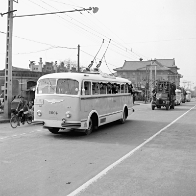 图6:上世纪50年代,北京有了无轨电车。图为4路电车经过交道口南大街。高宏/摄