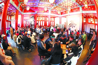 北京曲剧《茶馆》演出中,观众与演员一道坐在“老裕泰茶馆”收获沉浸式体验。何洪涛 摄