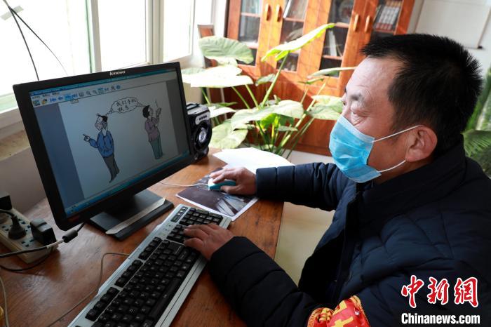 山东滨州的农民漫画家张新江拿起画笔,创作系列普及疫情防控知识的漫画。 贾海宁 摄
