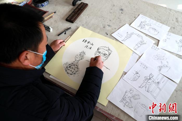 山东滨州的农民漫画家张新江正在创作普及疫情防控知识的漫画。 贾海宁 摄