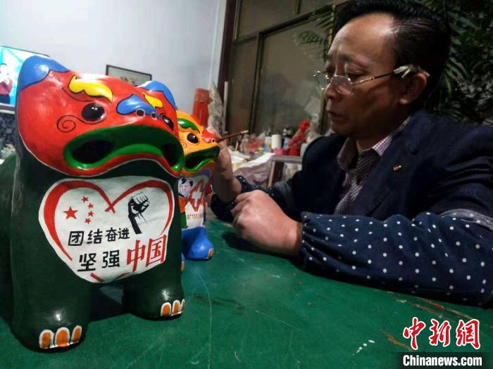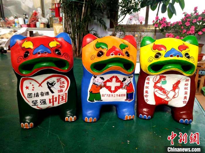 图为山东高密聂家庄泥塑非遗传人聂臣希、聂鹏父子制作的写有防疫、抗疫标语的泥塑“叫虎”。 受访者供图 摄