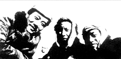 华君武(中)、蔡若虹、张谔在延安的讽刺画展上