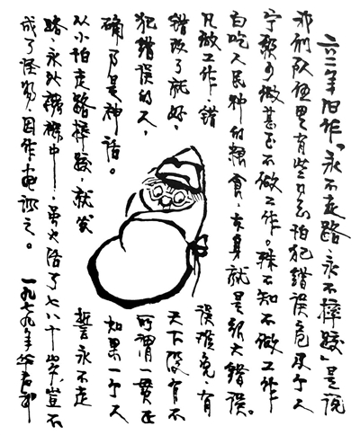 “1962年的《永不走路永不摔跤》,讽刺一味地追求不出事不犯错误,最后的结果就是永远都包在襁褓里。1979年华君武又重画了这幅作品,把画的历史背景交代出来了,旧作重画更增加了意味。
