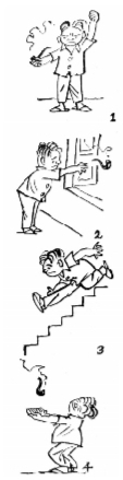 “1962年的四格漫画《决心》。第一格下决心一定要戒烟;第二格付诸行动把烟斗从窗户扔出去了;第三格片刻之间后悔顺着楼梯往下跑;第四格稳稳接住掉下来的烟斗,可见跑得有多快。标题是反语,根本没决心。画的也不是什么大事,但指出了缺点。