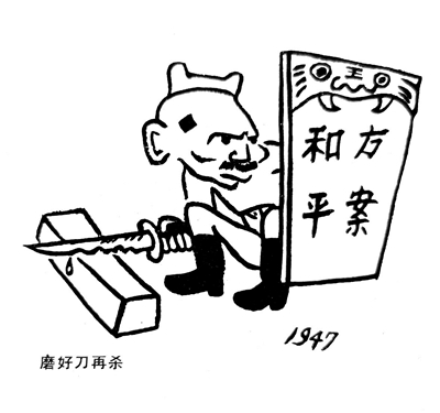 1949年10月,华君武从延安调到了东北,在《东北日报》发表了《磨好刀再杀》《榜样》《在反革命的后台》等一系列优秀作品。他塑造了入木三分的蒋介石漫画形象,并为大家所效仿。