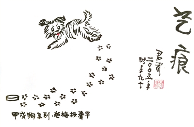 王九成收集到的华老的最后一幅漫画是2005年的《艺痕》,一只小狗撒欢跑着,身后留下一串梅花形爪印。这一年他已经90岁了。