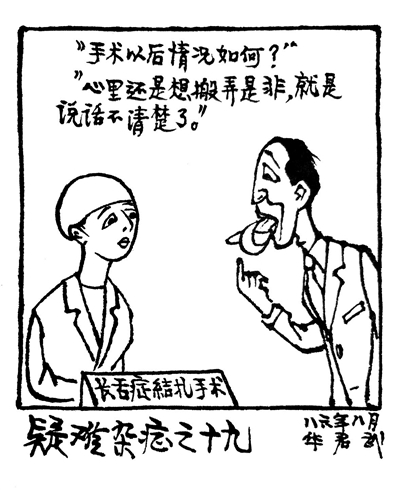 “疑难杂症系列”让人好气又好笑,“1986年的疑难杂症之十九,大夫问:手术以后情况如何?你看病人的舌头都系上一个扣了,回答说:心里还是想搬弄是非,就是说话不清楚了。中国人都知道舌头长代表什么意思。1987年的疑难杂症之三十四:虎头蛇尾症,没治!1987年的疑难杂症之三十六,病人的老婆跟医生解释:他贪污了分配给农民的化肥,就催成这样了……再看病床上这位,一脸尴尬和可气的劲儿。1989年的疑难杂症之五十八,讽刺:这是时下流行信谣传谣症,故从耳入口出,绝症也。现在也一样具有现实意义,你看微信上一波一波的谣言,都是不过脑子就转发。”