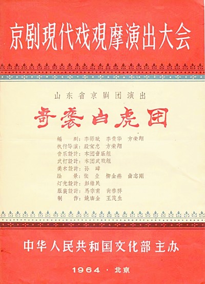 1964年全国京剧现代戏观摩演出大会,山东省京剧院《奇袭白虎团》演出节目单。