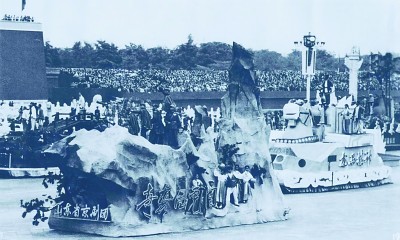 山东省京剧院《奇袭白虎团》剧组1964年在北京参加国庆花车游行。