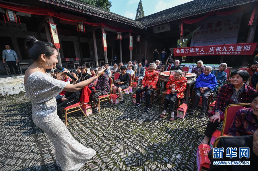 10月20日,演员在龙门古镇的祠堂里为老人们表演节目。 一年一度的重阳节即将来临。10月20日,浙江省杭州市富阳区龙门古镇开展敬老爱老欢度重阳活动,老人们收到手工长寿面和慰问金,还观看了越剧、杂技、歌曲等精彩的慰问演出。 据了解,龙门古镇政府给镇里700多位70岁以上老人送上慰问品和慰问金,营造“敬老爱老”的良好氛围,迎接重阳节的到来。 新华社记者 徐昱 摄