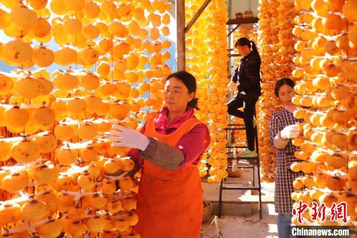 资料图:金黄的柿子挂满了房前屋后,一片黄澄澄金灿灿。 王小勇 摄