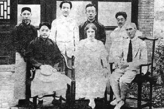1920年,罗素在中国。前排右起:罗素、勃拉克女士、蒋百里;后排右起:孙伏园、王赓、赵元任、瞿世英