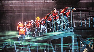 头顶如夜幕低垂,星光点点,“天空”延伸至四周墙面,所到之处皆铺染上蓝色灯光,100多片电子冰屏在舞台上碧波荡漾……
