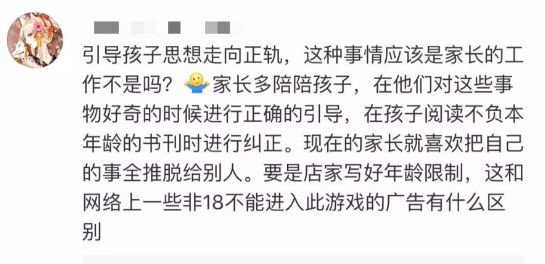 与此同时,另一部分网友则认为“书籍本来就是分类的,书店也不是童书店,家长要管好自己的孩子”“家长有些小题大做,草木皆兵了”……