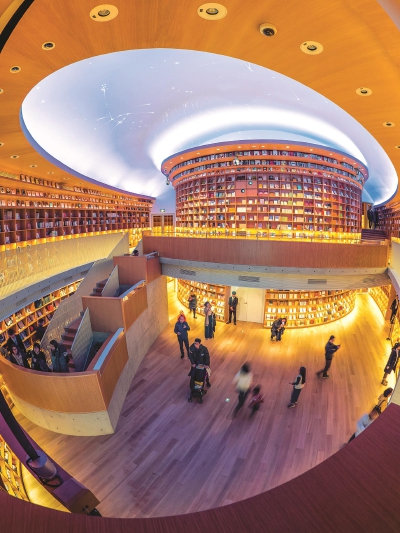 相较点击电子屏幕线上购书,实体书店的一大优势,是空间所提供的设计感与体验感。实体书店如何最大化空间价值,予人美好感受?新开的广富林书院,以现代设计元素平衡徽派老建筑原有的空间厚重感,打造出既时尚又富有历史积淀的静雅文化空间;光的空间·新华书店里,每一排书架都被方形镂空,层层书架尽收眼底,足有三层楼高的书架包围着整个环形空间,重复的方格和恰当的光线构成了无穷尽的书海幻境……这些书店本身自成一道独具魅力的人文景观。