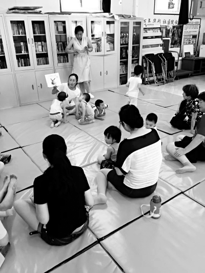 北京市社区儿童中心,家长带着孩子阅读。