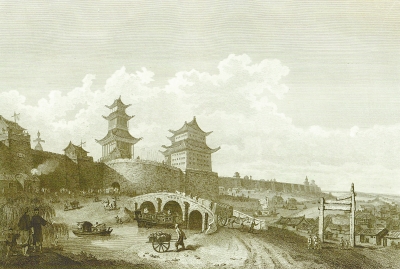 马戛尔尼使团成员、画家威廉·亚历山大绘制的北京城门,根据图中瓮城的形状、城门的方向和城内露出的塔尖判断,这应该是阜成门。从北京城里前往圆明园通常是经西直门,使团应该没有经过阜成门。亚历山大笔下的这座北京城门被后人无数次翻刻,成为西方人眼里北京城门的标准像。