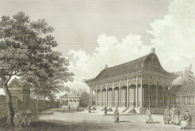 威廉·亚历山大绘制的圆明园内的正大光明殿,位于圆明园大宫门内,英国皇室送给乾隆皇帝的礼物摆放在正大光明殿内。对比乾隆宫廷画师绘制的《圆明园四十景图》,正大光明殿的形制和环境都相一致。