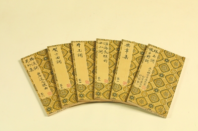 此次展览名为“缥缃流彩”——“缥”意为淡青色,“缃”则是浅黄色,古代人常用淡青、浅黄的丝帛作书囊书衣,“缥缃”用以指代书卷,也暗含书籍装潢的意味。展览分为“护帙”和“饰观”两大板块,“护帙”篇体现各种书籍装潢样式,“饰观”篇着重关注绘画、书法、篆刻等在装潢过程中的应用,另有“书具之美”“书衣之美”两个单元,呈现特别精美的书具、书衣。