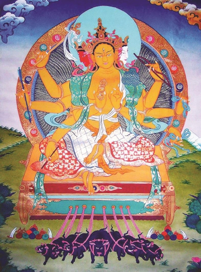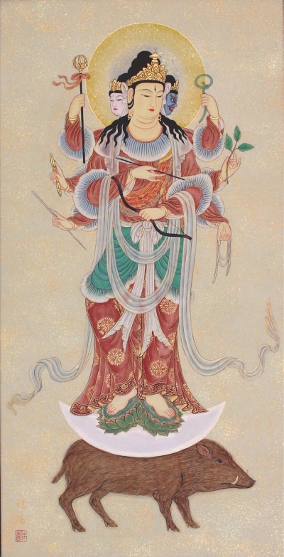据宋代太平兴国间来华北印度僧人天息灾所译《佛说大摩里支菩萨经》,摩里支菩萨的诸多法相中,既有站、坐莲花上的天女形象,也有三面六臂(或八臂)各持宝物的忿怒相。在后一种三面的法相中,必有一面作尖面獠牙之状。而她的坐驾,通常为一头巨大野猪,也可以是由七头野猪牵拉的拖车。均为资料图片