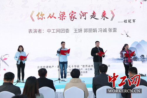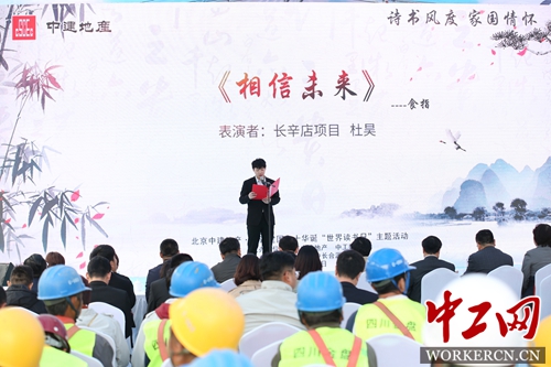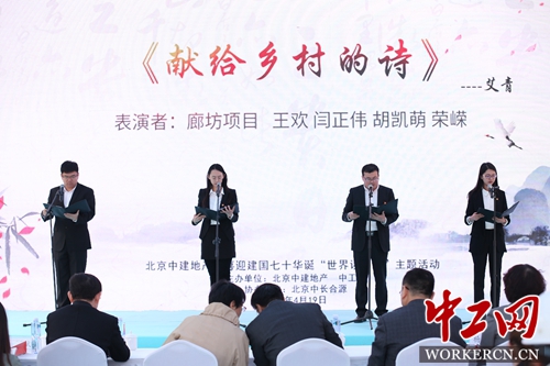 在第一个时代主题“开天辟地·丰羽高翔”中,地产公司长辛店项目和廊坊项目员工分别配乐朗诵了穆旦的《赞美》和艾青的《献给乡村的诗》,饱含深情的朗诵再次展现新中国建立这一伟大历史时刻。在第二个时代主题“苦难磨砺·不忘初心”中,长辛店项目员工深情朗诵了食指的《相信未来》,让在场的观众深切感受了信仰的力量。在第三个时代主题“复兴腾波·举世无俦”中,物业公司的《让我们一起奔腾吧》和长辛店项目员工的《致橡树》,表现了改革开放以来国家所发生的翻天覆地的变化和人民追求伟大复兴的热切希望。两个专题板块分别由中工网团委代表和公司总部员工表演。《你从梁家河走来》,生动展现了习近平总书记深耕基层、胸怀天下的国士大义;《太阳·七部书·土地篇》,展现了海子眼中的土地与家园,表达了北京中建地产公司“筑福天下”的理念与愿景。