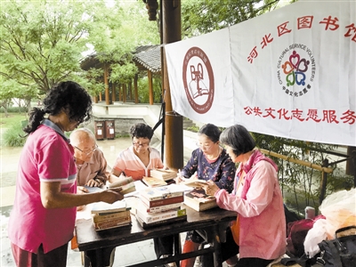 上周四上午,当记者来到河北区南普公园的“换书角”时,来自河北区图书馆公共文化志愿服务队的11名队员正在这里整理图书。这个由志愿者自发成立的“换书角”,每个月的第一个星期四都会举行一次换书借阅活动。而供大家借阅的图书,全部来自社会的捐赠。你可以来这里捐书,也可以借书;借书时无需付押金,也不用办理借阅证,只需要做简单登记,即可将书借走,下个月换书时归还即可。如今,这里已经成为附近居民以及外来务工人员免费借阅图书的重要场所,吸引着越来越多的爱书人自发前来借书、读书。