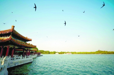 六月初夏,日暮时分的北海公园,凉风习习。北海北岸,成群的雨燕在曲桥连缀的五龙亭周围上下翻飞,与来来往往的游人,相映成趣。