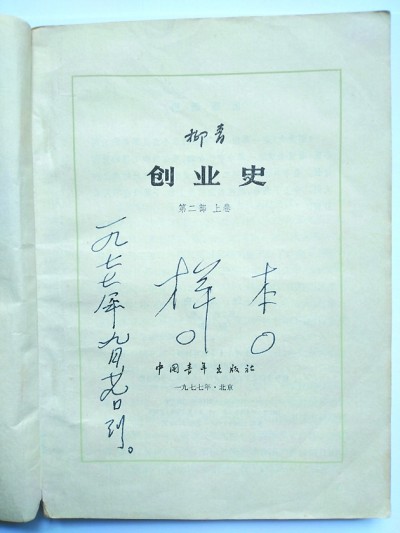 《创业史》责任编辑、中国青年出版社王维玲先生在专著《岁月传真》(首都师范大学出版社2009年9月出版)中,给我们解开了这个疑问。王维玲在书中《柳青洒在〈创业史〉上的生死情》一文中这样写道:“《创业史》二部上卷出版了,我立即托人将样书捎给他,为的是让病中的柳青高兴高兴。”自1960年《创业史》第一部问世到1977年出版第二部上卷,一晃过去了十多个春秋。柳青曾慨叹:“这上卷写于一九六○——一九六二年,放了十五年,重新拿起,一九七三年改了一次,一九七七年又改了一次,文学史上的小说,哪里有这样雕刻的。”捧着从北京千里迢迢送来的样书,抚摸着光洁的纸张,嗅着油墨的清香,为了文学事业在“文革”中饱受肉体和精神折磨的柳青此刻不知作何感想。但可以肯定的是,他郑重其事地在样书扉页签下了这个此生值得纪念的日子。由于样书直接来自出版社,未在市场流通,因而书上见不到加盖的销售印戳。