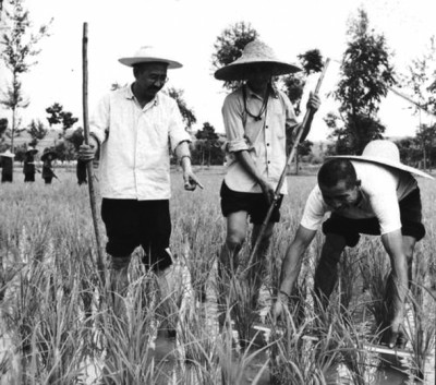 柳青(左一)与《创业史》主人公梁生宝的原型王家斌(右一)在稻田劳动。
