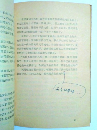 四、(第六章末句)第75页最后一句“王同志放心!我哭是为从前的事!”在后引号内增补:“不是怕劳动……”这句补充,写明了素芳怕前来安慰她的王亚梅误解自己是托病逃避劳动,也强化了她对早年自己不懂世事时所做错事的真心悔恨。