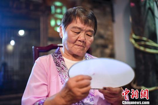 一位满脸皱纹的老母亲尝试刺绣。 杨华峰 摄