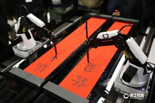 资料图:阿里云人工智能ET现场为员工书写春联。浙江在线记者 魏志阳 摄 图片来源:浙江在线