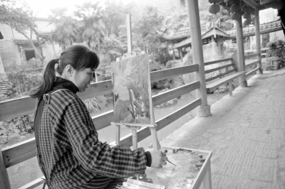 农妇在村中写生创作。