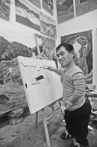 90后的沈明辉患有侏儒症,开始画画之前,他以卖气球为生。2015年11月,通过残联介绍,他开始在双溪镇安泰艺术城学习油画。内心充满兴奋和好奇的他画下了自己的处女作——《远山》。他感到,绘画其实并没有那么难,“只要你愿意一直去画。”他在绘画中探寻自己:“一张画就是你的那个世界。你想要怎么去创造,怎么让它变得更美好,这就是你的选择。”
