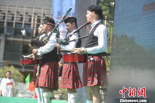身穿苏格兰传统服饰的国外民俗艺人在演奏风笛。 钟学满 摄