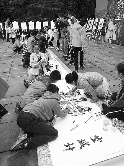 “三国画信”活动获奖小朋友在集市现场填色三国画