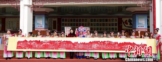罗华清和弟子们在展示八米剪纸长卷《歌仙刘三姐》。 高东风 摄