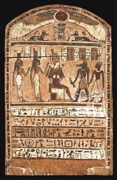 彩绘木碑 高52cm 宽32cm 托勒密时期(公元前332-30年)这件墓碑描绘了亡灵死后前往冥殿的场景:阴间守护者阿努比斯将亡灵带到冥王奥西里斯面前,冥王身后站着两位女神分别是生命女神伊希斯和丧葬女神奈芙缇丝。