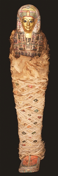 木乃伊与彩绘镀金木乃伊盒 高179cm 希腊-罗马时期(公元1-2世纪)这具男性木乃伊的身体以布带缠绕,制作成复杂的菱形图案。覆盖在头部的木乃伊面具彰显了他的贵族身份,脸部镀金,其他部分则绘有逝者向诸神敬献祭品的情景。古埃及人认为,诸神的骨骼是银质的,黄金象征他们的皮肤,在制作法老与贵族的木乃伊时,他们也会用黄金打造面具,让木乃伊拥有永恒的完美面孔。