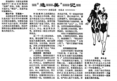 记者采访时看到了复试录像,不禁问道:“有些落选的姑娘不是也很漂亮吗?”主持报考工作的徐瑞香说:“光漂亮是不够的。从相貌上说,一般意义的漂亮不行,要有特点。更重要的是内在气质、文化修养,因此我们要求必须是高中以上文化程度。时装模特是个高雅的职业,俗气的人是干不来的。所以有位外国专家说,100个时装模特可以出99个明星,而100个明星却不见得能出1个时装模特。”(1986年12月20日《北京日报》2版,《“选美”记》)