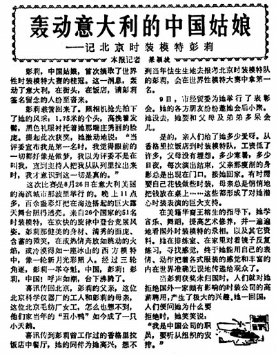喜讯传到彭莉曾工作过的香格里拉饭店中餐厅,以前的同事都为她高兴,想不到当年怯生生地去报考北京时装模特队的彭莉,会在世界性模特大赛中拿第一名。(1988年9月19日《北京晚报》1版,《轰动意大利的中国姑娘》)