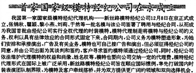 当时,模特经纪代理形式在国际上已被广泛采用。模特代理制是将模特与经纪公司的义务、权利以具有法律效应的合同形式固定下来。合同期内,公司为模特塑造形象,为她们安排和承接演出、广告及有关业务,依法维护模特的肖像、姓名权等。模特也要向公司交纳一定的代理费。(1992年12月12日《北京日报》5版,《首家国家级模特经纪公司在京成立》)