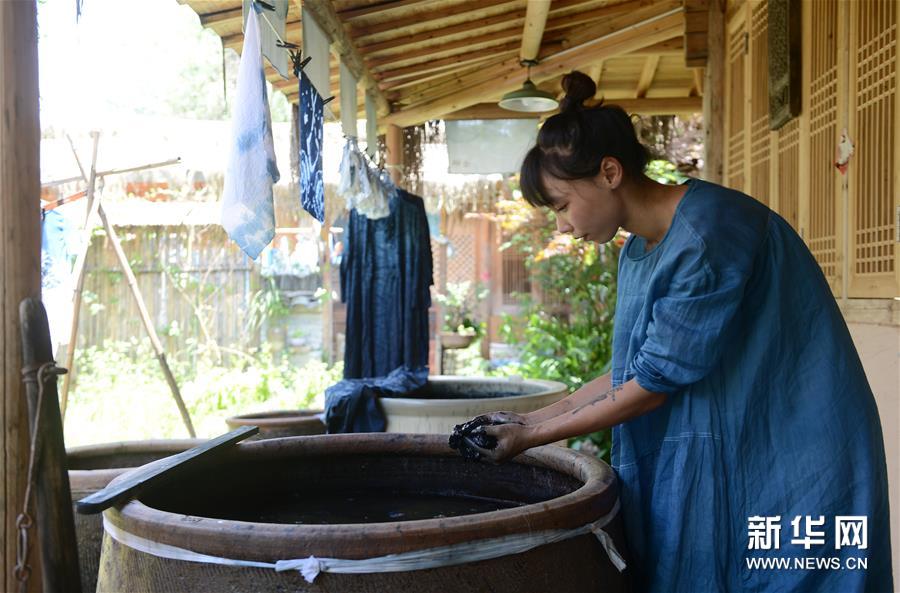 6月30日,陈燃在染坊中制作染料。1994年出生的四川姑娘陈燃大学毕业后迷上了蓝染工艺,并前往贵州丹寨山村的古法染坊向当地的手艺人学习。2017年,陈燃在丈夫的老家安徽黟县建立了自己的蓝染工坊。 蓝染是一种古老的印染工艺,用蓝染植物发酵后制作成染液,通过绑扎、浸泡、氧化和晾晒,让布料拥有独一无二的蓝色。“学习蓝染需要很大的耐心,要学会‘养缸’,不断调整染料的配比,染缸的状态决定了成品的效果。”陈燃说。经过无数次对染料成分和布料的试验,陈燃熟练掌握了传统的蓝染技艺,并继续探索创新。 2018年,陈燃应顾客要求定制蓝染产品,从衣服逐渐扩展到门帘、床单、抱枕、餐垫等家居用品。在设计方面,在保留传统特色的同时,陈燃对传统图案和样式进行了改良,更加注重产品的实用性、简约性。 染坊成立三年多以来,陈燃坚持开设蓝染体验课程,为游客示范、讲解蓝染技艺,接待游客超过十万人次。“我希望通过自己的努力能让更多的年轻人了解蓝染,让‘一抹蓝’走进更多人的生活。”陈燃说。新华社记者 韩晓雨 摄