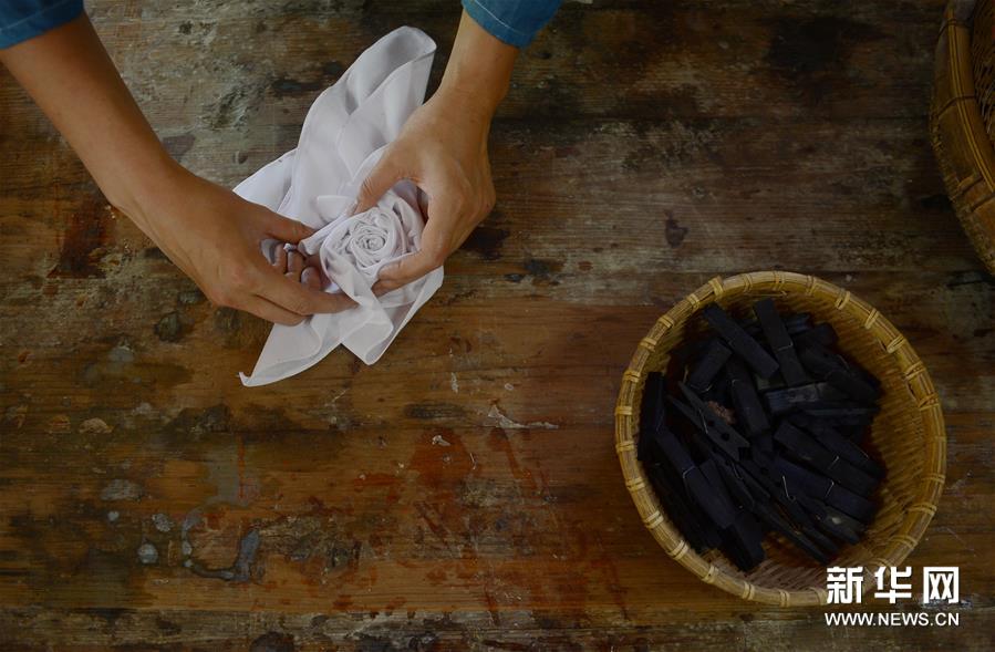 6月30日,陈燃在染坊中绑扎布料。新华社记者 韩晓雨 摄