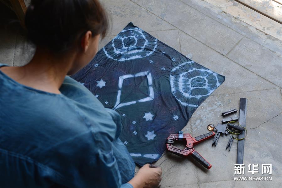 6月30日,陈燃在染坊内摊晾正在氧化的蓝染作品。新华社记者 韩晓雨 摄