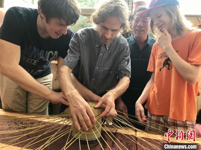 外国友人观看手艺人制作藤编制品。 李典 摄