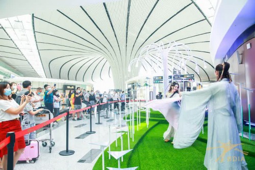 8月25日,后疫情时代,北京大兴国际机场举办以“爱在七夕,兴有灵犀”主题活动。为主题,探寻前沿装置艺术和机场建筑氛围的交集,为凝固的底蕴注入灵动的形象,并在适应当下的安全基础上,专注于原创情景表演,因地制宜打造国潮复兴、诗意盎然、温馨祥和、大气雅致的文化实验田。