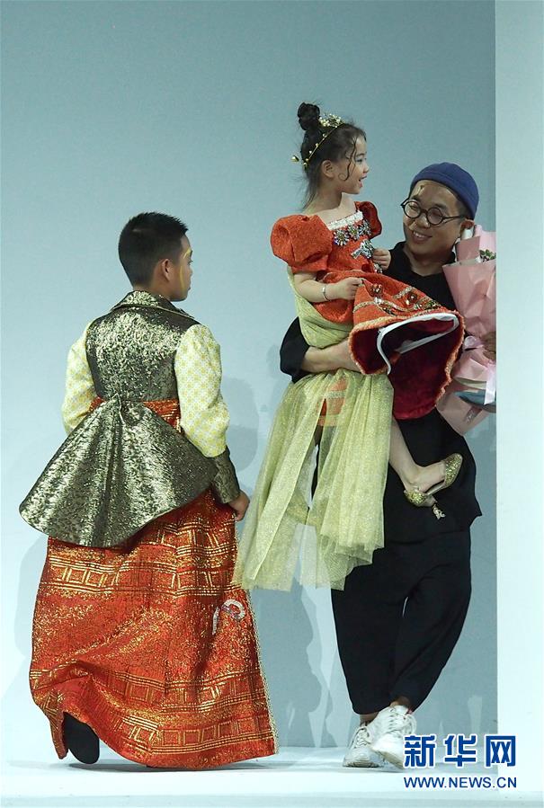 10月16日晚,中国十佳童装设计师陈翔飞(右)与小模特在FUNNY DREAM童装发布会上。 当日,2021春夏上海时装周在静安800秀场举行FUNNY DREAM童装发布会,推出由中国十佳童装设计师陈翔飞全新立体剪裁和版型结构的童装礼服。 新华社记者 任珑 摄