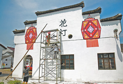 浙江省东阳市画水镇许宅村新厅自然村房前屋后,进行暑期社会实践的大学生们忙着绘制花灯墙绘,不时有村民驻足欣赏。