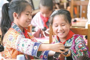 为传承和发展本地少数民族传统手工技艺,广西柳州市融水苗族自治县易地扶贫搬迁安置点的苗家小镇小学46名学生参加刺绣学习。